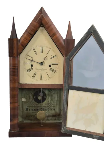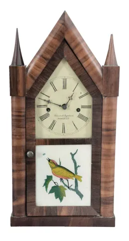 Brewster & Ingrahams, Bristol, Conn., "Sharp Gothic" shelf clock with a spring driven 30 hour time and strike fusee movement in a mahogany veneered case. The case has been nicely refinished. The signed dial is original. The hands are replacements. The door glasses appear to be original with some restoration to the lower glass. The right finial tip shows some loss. There is a minor veneer repair to the lower left hand return. The label is very good. A very attractive clock.