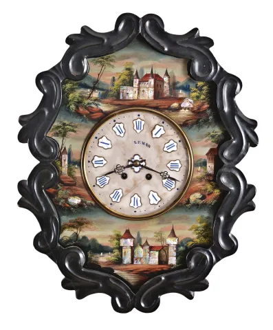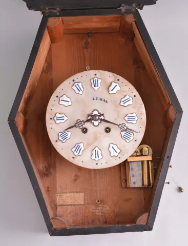 France, morbier baker's wall clock, 8 day, time and strike, spring driven movement with music on demand by pull repeat in an ebonized wood case with painted dial surround and raided cabochon numerals on a glass dial signed "LEMAN" the frame retains its original ebonized surface with several repairs. The dial has several cracks and repairs. The glass over the dial is absent. Music box is operational.