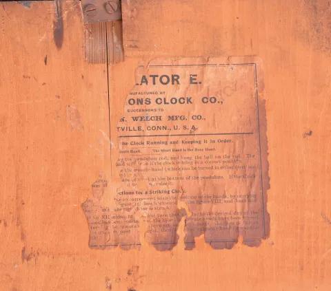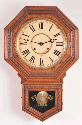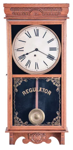 Clocks- 3 (Three) American wall clocks, 8 day, spring driven in oak cases: (1) Wm. L. Gilbert Clock Co. school house, time and strike; (2) Sessions Clock Co., store regulator, time only with calendar; (3) E. Ingraham & Co., store regulator, time only sold "as is". (1) no glass over dial.
