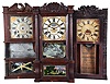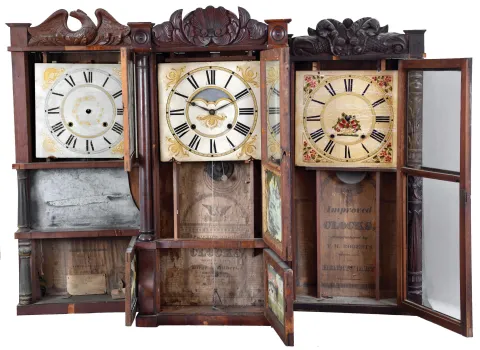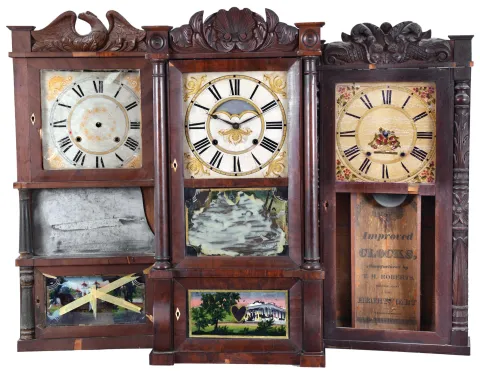 Clocks- 3 (Three): American shelf clocks: (1) Jared Arnold, Jr., Amber, NY, triple decker shelf clock with a weight driven, 8 day, time and strike strap brass movement in a mahogany veneered case with a carved eagle splat., c 1838; (2) T. M. Roberts (for Henry Hart), Bristol, Conn., carved column and splat shelf clock with a weight driven 30 hour time and strike wood movement in a mahogany veneered case, c1835. (3) Birge & Gilbert, Bristol, Conn., full column and carved splat shelf clock with a weight driven, 8 day, time and strike strap brass movement in a mahogany veneered case, c1838. (1) The case has significant veneer loss. The original painted dial has multiple horizontal loss lines. The hands are missing. The center door mirror is broken. The original lower glass shows loss. No weights; (2) The case has an old finish and has veneer loss is several areas. The original painted dial has horizontal loss lines. No weights. (3) There is veneer loss in several areas. The original painted dial is in excellent condition. The hands are original. The center tablet is mostly gone. The original lower tablet is intact with some loss. No weights. ***NOTES*** The dimensions are for clock number 1.