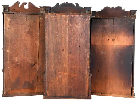 (1) The case has significant veneer loss. The original painted dial has multiple horizontal loss lines. The hands are missing. The center door mirror is broken. The original lower glass shows loss. No weights; (2) The case has an old finish and has veneer loss is several areas. The original painted dial has horizontal loss lines. No weights. (3) There is veneer loss in several areas. The original painted dial is in excellent condition. The hands are original. The center tablet is mostly gone. The original lower tablet is intact with some loss. No weights. ***NOTES*** The dimensions are for clock number 1.