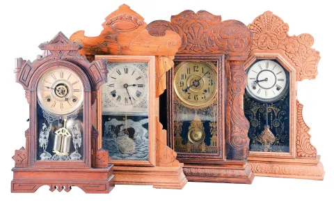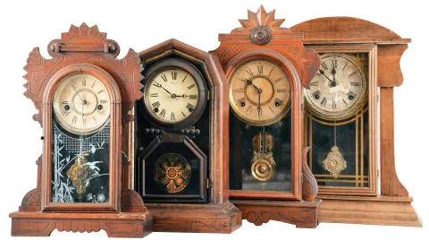 Clocks- 8 (Eight) Mantel and Parlor: assorted 8 day, time and strike, two with alarm, in wood cases by makers including Sessions, Welch, Waterbury, Seth Thomas, Ingraham, and New Haven.