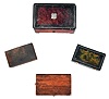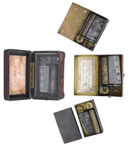 Music boxes- 4 (Four): Three with tin cases, two of those with transfer scenes decorating the covers, and one burl veneered box
