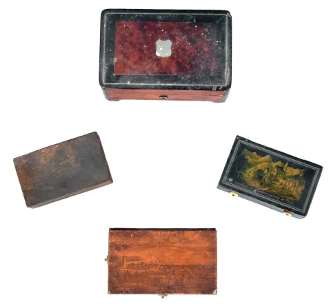 Music boxes- 4 (Four): Three with tin cases, two of those with transfer scenes decorating the covers, and one burl veneered box with losses, for parts or restoration