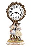 French Figural Bedside Night Clock with arabic numeral glass dial and diamond-shaped steel hands enclosed within a cast brass flower and fruit garland bezel and stand supporting a single candle holder at the back, two bisque young lady figures standing in joyful bliss in the flower garden all on a porcelain and gold decorated stand, one-day French movement with tic-tac escapement and watch winding key. Overall good condition with no breakage of bisque figures or base, very slight loss of color on right red shoe, movement ticks when wound. These clocks were based on much older examples which provided light by candle at night to see the time.