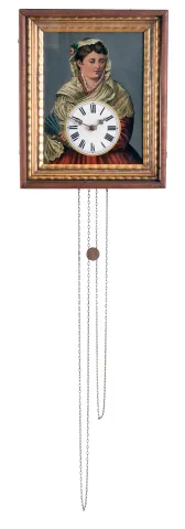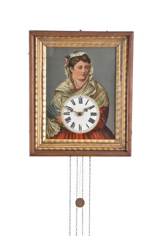 Germany, an attractive, picture frame "Augenwender" or turning eye clock, the hardwood frame with gilt, ripple molded liner, and containing a hand tinted transfer of a young woman in a red dress with shawl, and a folding fan in her left hand, Roman numeral white painted dial, brass hands, and 30 hour time and strike movement with wooden plates, counting the hours on a bell, and animating the girl's eyes frame dirty, liner with some tarnish, painting with a few minor losses, dial with minor loss at center, hands tarnished, replaced movement, ticks and strikes, weights missing, incorrect pendulum