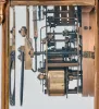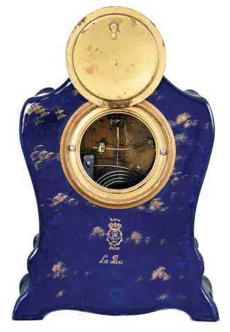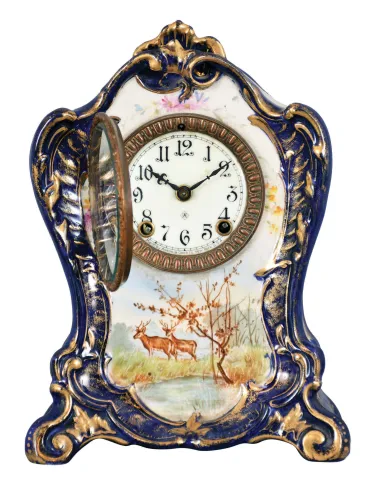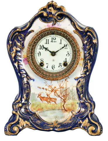 (1) Pretty porcelain case has some minor wear to the applied gold. Original porcelain dial is perfect. Original hands. Someone has painted the brass rear access door in gold paint. Movement is signed; (2) Unsigned movement, Dial and hands are in good condition as are the beveled glasses. Case is a bit dingy with some wear to the gilding. Dimensions provided are for the Ansonia. Sold "as is".