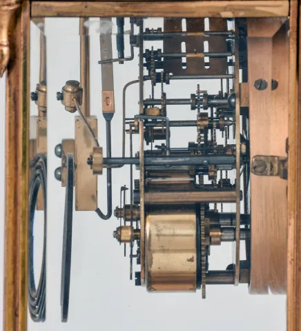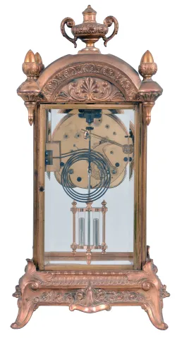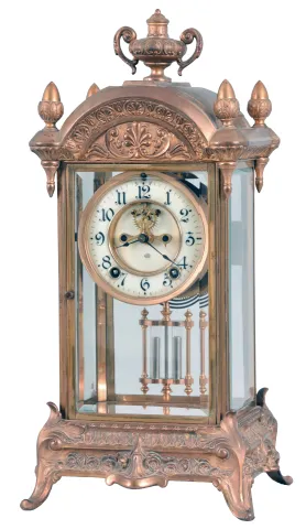 Clocks- 2 (Two) American shelf: (1) Ansonia Clock Co., New York, "La Pau", 8 day, time and strike, spring brass movement porcelain mantel clock; (2) Jennings Brothers. Bridgeport, Conn., crystal regulator, 8 day, time and strike, spring driven movement with visible Brocot escapement in a cast brass and glass case with porcelain dial. (1) Pretty porcelain case has some minor wear to the applied gold. Original porcelain dial is perfect. Original hands. Someone has painted the brass rear access door in gold paint. Movement is signed; (2) Unsigned movement, Dial and hands are in good condition as are the beveled glasses. Case is a bit dingy with some wear to the gilding. Dimensions provided are for the Ansonia. Sold "as is".