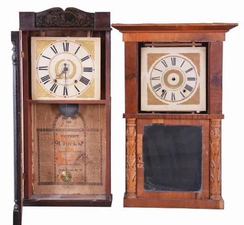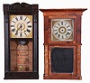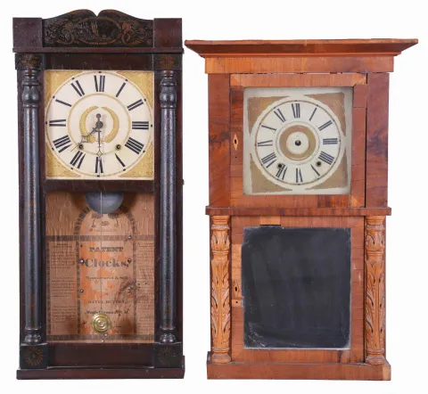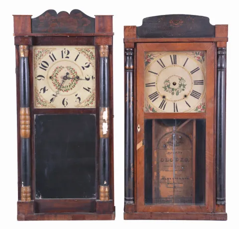 Clocks- 4 (Four): (1) E. W. Adams, Seneca Falls, New York, 30 hour, time and strike, weight wood movement carved column and cornice top shelf clock, c1835; (2) David Dutton, Mount Vernon, New Hampshire, 30 hour, time and strike, weight wood movement half