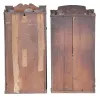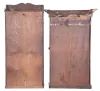 (1) Mahogany veneered case in an old finish has loss on the base, the doors and top edge of the cornice. Some of the veneer on the doors has been replaced. Replaced mirror. Original wood dial is fairly clean for its age. Hands are missing; (2) Mahogany veneered case in original crazed finish. Original painted dial is in nice condition. Original hands and pendulum. Mirror missing. Darkened label with some loss inside. (3) Mahogany veneered case in original finish has loss on the base, repair at the bottom hinge, some loss on the gilt columns and some damage at the chimney caps. Original painted dial is clean for its age. Original hands. Replaced mirror. Dark label inside. (4) Mahogany veneered case has veneer loss on the base, the door and the left chimney block. Original painted dial is fairly clean for its age. Bottom right block is missing. Chimney caps are missing. No hands or pendulum.