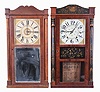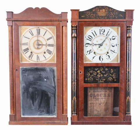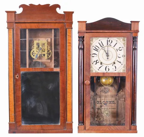 Clocks- 6 (Six): (1) David Dutton, Mount Vernon, New Hampshire, 30 hour, time and strike, weight wood movement quarter column & splat shelf clock, c1830; (2) Williams Orten, Prestons & Co., Farmington, Conn., 30 hour, time and strike, weight wood movement half column & splat shelf clock, c1832 (3) Putnam Bailey, Goshen, Conn., flat column & splat case, c1830 with later movement (4) Williams Orten, Prestons & Co., Farmington, Conn., 30 hour, time and strike, weight wood movement half column & splat shelf clock, c1832 (5) George Marsh & Co., Farmington, Conn., 30 hour, time and strike, weight wood movement half column & splat shelf clock, c1830 (6) George Marsh & Co., Farmington, Conn. Half column & splat case only, c1830 (1) Mahogany veneered case in an old finish has veneer loss on the base. Top is a replacement. Original painted dial is clean. Original hands. Period mirror. Dark label inside; (2) Mahogany veneered case in an old finish in nice condition. Original painted dial has some wear to the chapter ring. Original hands and pendulum. Original stenciling on the columns. Slight dark label inside. (3) Mahogany veneered case with curly maple columns in an old finish has small loss on the cross strip. Case currently has a sessions spring movement. (4) Refinished mahogany veneered case has veneer loss on the base and upper right column block. Dial restored. Original bottom glass now clear. Original hands. (5) Refinished mahogany veneered case has a small veneer piece missing on the base. Period mirror and original hands. Dial is missing. Clean label inside. (6) Mahogany veneered case in original finish. Period mirror.