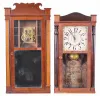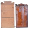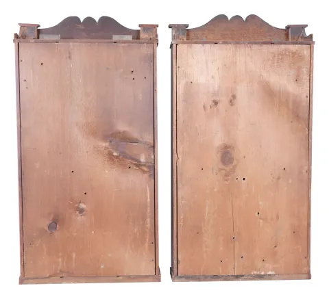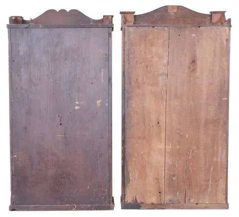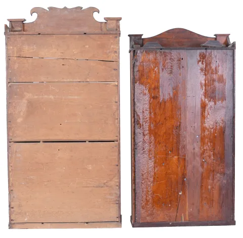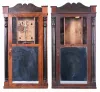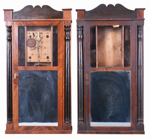 (1) Mahogany veneered case in an old finish has veneer loss on the base. Top is a replacement. Original painted dial is clean. Original hands. Period mirror. Dark label inside; (2) Mahogany veneered case in an old finish in nice condition. Original painted dial has some wear to the chapter ring. Original hands and pendulum. Original stenciling on the columns. Slight dark label inside. (3) Mahogany veneered case with curly maple columns in an old finish has small loss on the cross strip. Case currently has a sessions spring movement. (4) Refinished mahogany veneered case has veneer loss on the base and upper right column block. Dial restored. Original bottom glass now clear. Original hands. (5) Refinished mahogany veneered case has a small veneer piece missing on the base. Period mirror and original hands. Dial is missing. Clean label inside. (6) Mahogany veneered case in original finish. Period mirror.