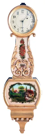 Movement wants cleaning, lower glass loose in frame, minor losses on gilding, probable original 20th century finish. No weight or finial. Nelson H. Brown was a Boston clock dealer. Tablets in this clock by W. W. Sprague & Co. who supplied many Boston area glasses in this early 20th century period.