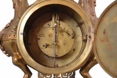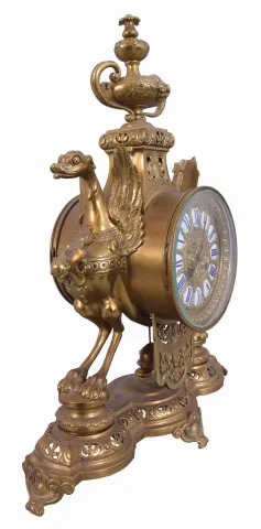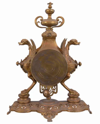 France, figural brass mantel clock, 8 day, time and strike on a pierced base with two short pillars supporting winged griffon figures in profile flanking a central cylinder holding an ornate brass dial with blued steel hands and white enameled cartouche numerals in blue, surmounted by a decorative urn. The pendule de Paris movement with partially exposed pendulum is stamped "CHLES MT". heavy brass cast is dusty but in very good condition Enameled numerals are fine. There is a deep scratch in the beveled glass. Movement ticks and strikes, but was not tested long term.