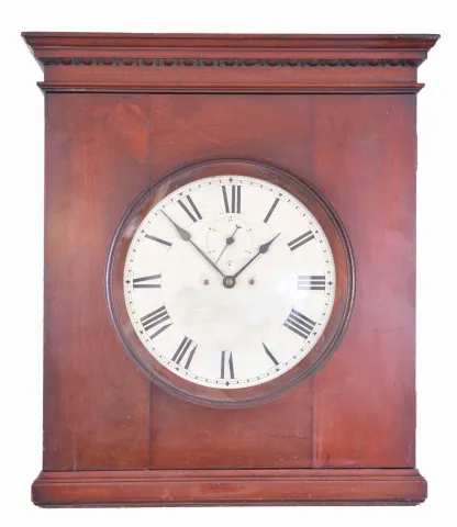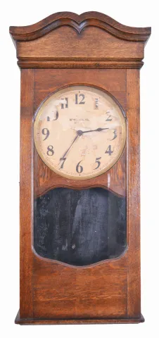 Clocks- 2 (Two) Electromechanical Wall: (1) Sempire Clock Company, St. Louis with F. L. Gregory patented electromechanical movement in a red mahogany case with a 12 inch painted metal dial; (2) Rempe Manufacturing Co., Danville, PA, self-winding battery