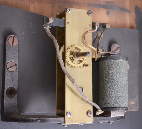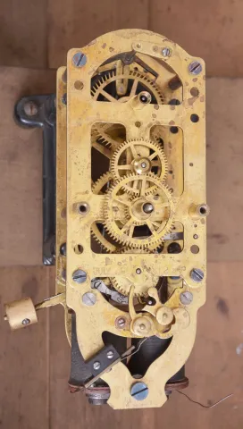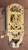 (1) Electrical components will need to be restored. Pendulum rod and bob appear to be original. Dial has been repainted poorly; (2) Rare model from a short-lived company. The pendulum is absent. Clock mechanism will need to be restored. Paper dial is stained and torn. Dimensions provided are for Rempe. Sold "as is".