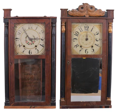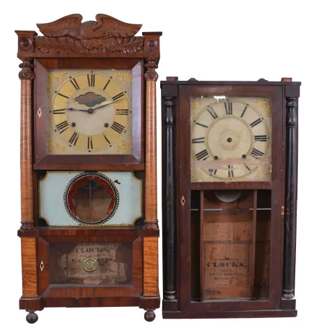 Clocks- 4 (Four): (1) Riley Whiting, Winchester, Conn., half column shelf clock with a weight driven 30 hour time and strike wooden works movement in a mahogany veneered case, c1835; (2) C. & L. C. Ives, Bristol, Conn full column and eagle splat shelf clock with a weight driven, 8 day, time and strike riveted strap brass movement in a mahogany veneered Empire two decker case with tiger maple columns and trim and carved eagle splat, c1835; (3) Elisha Hotchkiss, Burlington, Conn., half column and splat shelf clock with a weight driven 30 hour time and strike wooden works movement in a mahogany veneered case, c1834. (4) Williams, Orton, Preston's & Co., Farmington, Conn., half column and splat shelf clock with a weight driven 30 hour time and strike movement in a mahogany veneered case, c1838. (1) The case has several areas of veneer loss. The hands and weights are missing. The dial has significant paint loss. The case top pillars, splat and returns are missing; (2) The case has veneer loss in several areas. The original painted dial has minor loss. The hands are original. The upper glass and decorated middle glass are original. The lower clear glass may be replaced. (3) There is extensive veneer loss on the base. The top right chimney, return and the splat are missing. The weights are missing. The original painted dial is in good condition but the numerals are weak. The upper door glass is original. the lower glass is a replacement. (4) The case has veneer damage and repair in multiple locations. The painted dial shows some wear. The hour hand is missing The upper door glass is original. The lower glass (mirror) may be a later replacement The weights are missing. ***NOTE*** The dimensions are for clock number 2.