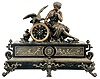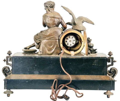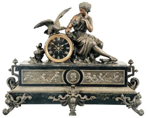 France, Figural Mantel Clock with Electric Movement, patinated Belgian slate case with brass and spelter figure and decoration, a seated young lady holding grapes and feeding a large raptor perched on top of the black and gold dial with roman numerals and gilt spade hands, the lower section of the case with classical puti facade centering on a goddess profile, all on feet of claw and ball feet and central bracket, the movement now with antiquated electric movement. Original round French movement now replaced with an electric movement. Movement should be checked before plugging into a wall socket. Case needs cleaning.