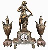Irving Miller & Co., France, three-piece figural mantel clock with garniture, red and grey marble base on cast bell-shaped feet supporting clock with polychrome enamel dial, flanked by acanthus ornaments and surmounted by a cast spelter female figure