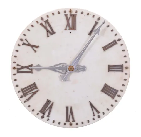 Clocks- 2 (Two) Wall Clocks: (1) Self Winding Clock Co., New York, "Marble Dial Clock" electrically wound 18 inch gallery wall clock with primary movement, white marble dial with raised bronze Roman numerals, aluminum hands, brass pendulum bob, wood stick