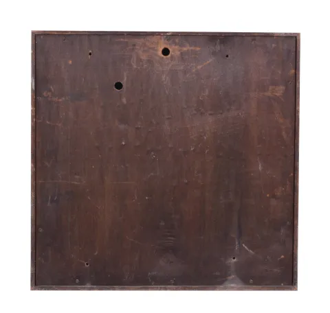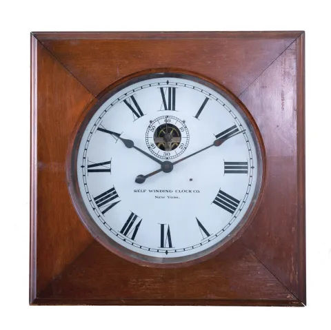 Clocks- 2 (Two) Wall Clocks: (1) Self Winding Clock Co., New York, "Marble Dial Clock" electrically wound 18 inch gallery wall clock with primary movement, white marble dial with raised bronze Roman numerals, aluminum hands, brass pendulum bob, wood stick, wires, battery holders, all inside the round wood box housing the movement; (2) Self Winding Clock Co., New York, square gallery clock with primary movement, open seconds bit, 14 inch signed metal dial, brass pendulum, wood stick, wires, battery holders in a mahogany case. (1) Wiring will need attention. Marble dial is in good condition Hands have serial number on brass counterweights, so appear original; (2) Movement will need attention. Original paper instructional labels and metallic identification tags present. Wood finish has some scratches. Hands are rusty. Sold "as is".