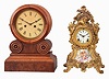 Clocks- 2 (Two): (1) Ansonia Clock Co., New York, "Trianon" shelf clock with a spring driven, 8 day, time and strike movement in a gilt cast metal case, c1914; (2) Ingraham Clock Co., Bristol, Conn., "Grecian" shelf clock with a spring driven 30 hour time and strike movement in a walnut case, c1875. (1) Much of the gilt finish remains. The porcelain dial has no hairlines or chips. The hands are original; (2) The case has lost some of its finish. The original paper dial has aged. The hands are original. The glass is original.