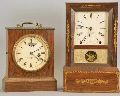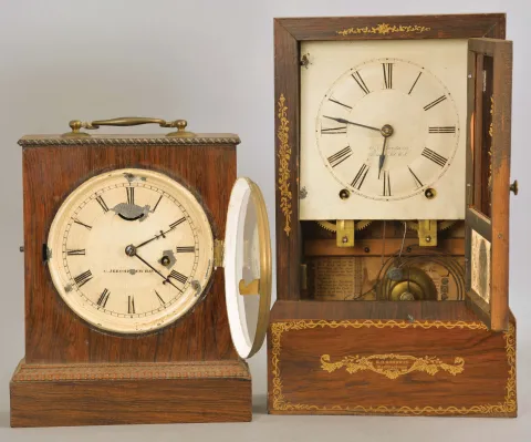 Clocks- 2 (Two): (1) Chauncey Jerome, New Haven, Conn., 30 hour, spring brass lever movement ripple molding shelf clock, c1850; (2) E. O. Goodwin, Bristol, Conn., 8 day, time and strike, spring brass movement cottage shelf clock, c1850. (1) Rosewood veneered case in good condition has a small piece of the ripple molding and veneer missing on the back upper right corner. Original painted dial has scattered loss. Minute hand is a replacement, but similar to the original. Movement is signed; (2) Rosewood veneered case in original finish has a thin piece of veneer missing on the base, a small piece missing on the door, a ding on the base and the top left side. Original painted dial in nice condition for its age has minor loss at the mounting screws. Hands are replaced. Original tablet and gilt decoration on the base and case is fine. Upper glass is missing.