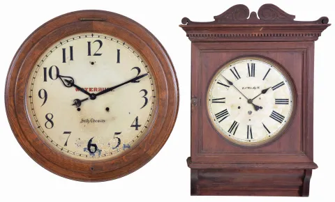(1) The solid oak case appears to have been refinished some time ago. The time and strike movement is very unusual for a gallery clock but appears to be original to the case. The hands and door glass are both original. The original painted dial, signed Seth Thomas and also bearing the name "Waterbury" has flaking issues around the numerals 5 and 6; (2) The darkly stained case has very little, if any, finish remaining. The movement is very similar to that used in the number 11 and 12 hanging regulators, except with a short (12 inch) pendulum length, The painted dial has been covered over with a finish and the dial shows some discoloration. The hands appear to be original. The movement is signed. The door glass is original. There are two posts on the case back above the movement that suggest a wired connection to the movement.