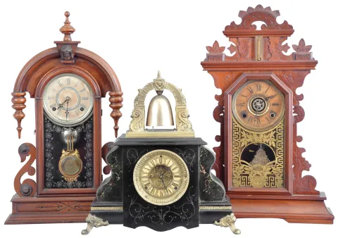 Clocks- 3 (Three): (1) F. Kroeber Clock Co., New York, "Parisian", 8 day, time and strike, spring brass movement walnut mantel clock, c1881; (2) William L. Gilbert Clock Co., Winsted, Conn., "Curfew", 8 day, time and strike, spring brass movement bell top mantel clock, c1900. (3) E. Ingraham & Co., Bristol, Conn., "Pansy", 8 day, time and strike, spring brass movement walnut mantel clock, c1881. (1) Walnut case in original finish in nice condition. Original paper dial has age darkened with some surface abrasion. Original hands, fancy pendulum & tablet; (2) Black enameled case including the green marbleized paint is in very nice condition. Original paper dial behind the skeletonized dial mask has age darkened a little. This is the better dial type found on this model. Original hands. Movement is signed. (3) Walnut case in an old finish in nice condition. Original paper dial has age darkened with stains around the winding arbors. Original pendulum, hands and tablet. A very dark label inside.