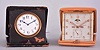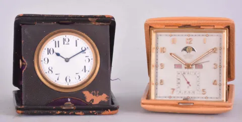 Clocks- 2 (Two): Both travel models, the first an Angelus "Folioluxe", 8 day, 15 jewel lever movement with triple calendar, phases of the moon, and alarm, Arabic numeral silvered dial, luminous baton hands, the other a minute repeater marked "Columbia