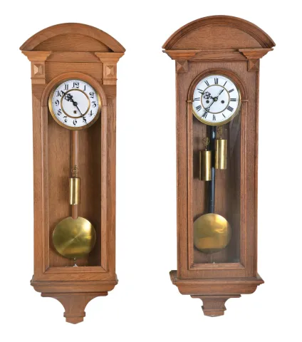 Clocks- 4 (Four) European wall clocks: (1) Fl. Heike? Goriz, Germany R/A spring driven in a walnut case; (2) French baker's clock with glass dial; (3) Vienna regulator time only, weight driven in an oak case; (4) Vienna regulator time and strike, weight driven in an oak case sold "as is". Clocks are all complete with pendulums and weights. Dimensions are of largest clock.