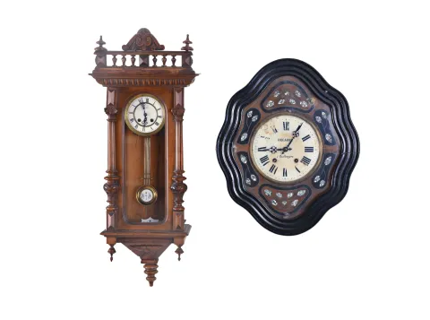 Clocks- 4 (Four) European wall clocks: (1) Fl. Heike? Goriz, Germany R/A spring driven in a walnut case; (2) French baker's clock with glass dial; (3) Vienna regulator time only, weight driven in an oak case; (4) Vienna regulator time and strike, weight