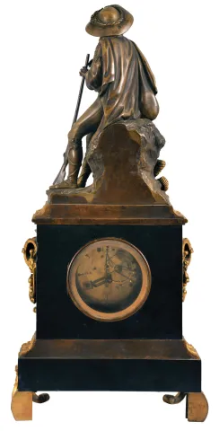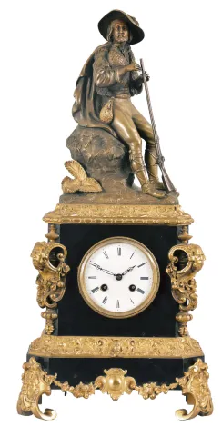 France, a bronze and black slate figural mantel clock, the stone case with canted corners, and replete with gilt masks and naturalistic ornament, surmounted by a figure of a hunter in a rustic landscape, Roman numeral white enamel dial, blued steel hands, and 8 day, time and strike pendule de Paris movement with silk thread suspension, signed "Gonin Aine" dirty, stone with minor flakes and chips, gilding and patination good, dial with hairline and chips, ticks and strikes, bell missing, pendulum replaced