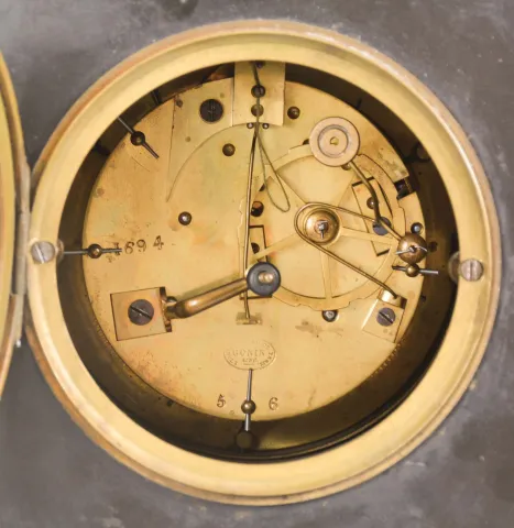dirty, stone with minor flakes and chips, gilding and patination good, dial with hairline and chips, ticks and strikes, bell missing, pendulum replaced