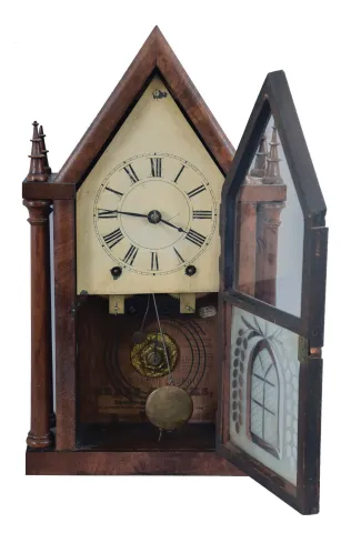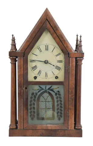 Brewster & Ingrahams, Bristol, Conn. (sold by Daniel Pratt & Sons), Four Column Sharp Gothic shelf clock with a (brass) spring driven, 8 day, time and strike movement in a mahogany veneered case The case has been refinished and shows some veneer loss in several locations. The two left finials show some loss at the top. The door keyhole shows some loss. The painted dial is original with very minor paint loss and some yellowing of the dial paint. The hands are original. The movement is signed. The label is in very good condition with a Daniel Pratt & Sons overpasted label. The top door glass is original. The acid etched lower glass is original.