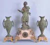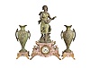 France, Variegated Pink Marble Figural Clock Garniture, the clock with off-white arabic numeral dial within a brass bezel and beveled glass set within the marble case with scroll work dial surround, on raised feet and and plinth for the statue titled "La