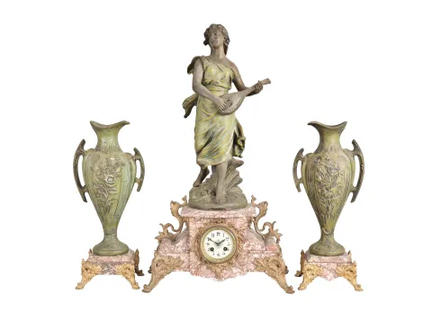 France, Variegated Pink Marble Figural Clock Garniture, the clock with off-white arabic numeral dial within a brass bezel and beveled glass set within the marble case with scroll work dial surround, on raised feet and and plinth for the statue titled "La Cigale" a sculpture first presented by Sylvain Kinsburger, the patinated figure of a young maiden no doubt playing the 'Song of the Cicada' on her lute, eight-day spring powered, round French movement with count-wheel hour and half hour strike on a bell, together with two matching and imposing ewers with floral facades and carrying handles on raised pink marble bases with gilt feet. Movement needs overhaul, all marble in good condition, gilt parts re-gilded.