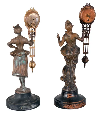 Clocks- 2 (Two) Mystery Swingers: (1) Diana with porcelain arabic numeral dial with Junghans logo mounted on the pendulum and suspended from the patinated figure's outstretched arm, one-day movement, all on an ebonized turned wooden base; (2) Country Lady in bustled dress and apron on a composite turned base, unmarked Arabic numeral porcelain dial and one-day movement. (1) Some losses on ebonized base, movement cleaned and overhauled, lacking crystal (2) Repro figure and base, probable period movement and dial.