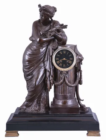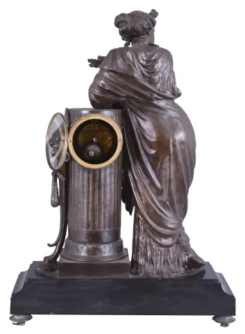 France, extra large patinated spelter figural clock, depicting a tall woman in classic Greek gown, (figure is 25"), standing beside a fluted pedestal with footed accents, and with a good bell strike movement. the bronze colored paint has failed in a couple of places, revealing spelter and flux beneath. The large piece of marble is very heavy and would make you think it is bronze, but it is not. Movement is sound; would benefit from cleaning. Large and imposing.