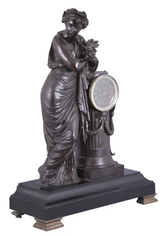 France, extra large patinated spelter figural clock, depicting a tall woman in classic Greek gown, (figure is 25"), standing beside a fluted pedestal with footed accents, and with a good bell strike movement.