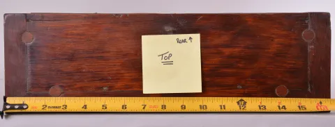 Mahogany veneered case in an old finish has chips and loss on the base and top. A small veneer piece near the door knob is missing and at the door corners. Original signed painted dial has some small stains, but is in otherwise nice condition. Original table has scattered loss. Gong base and gong are missing. The strike side spring is missing. Hands may be replaced. Movement is signed. Nice card label inside.