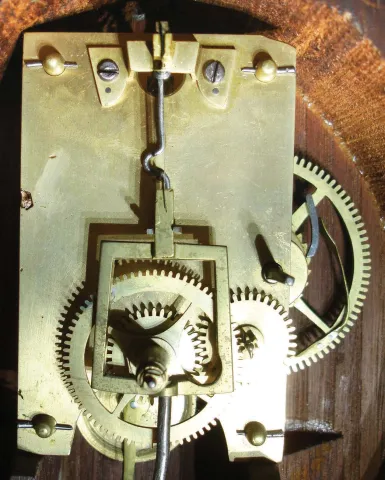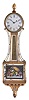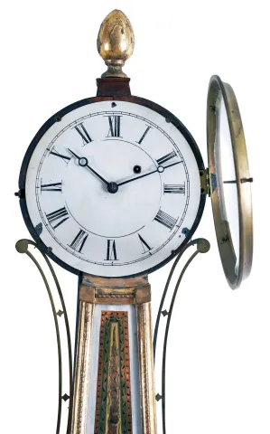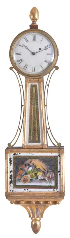 Patent Timepiece or "Banjo" Clock, Concord, Massachusetts, the mahogany veneered, gilded rope molded case with acorn finial over the zinc roman numeral dial, original reverse-painted glasses, the lower depicting "Aurora" on her festooned chariot driven by two winged horses set before a gleaming sunrise and framed within a geometric border, the waist glass flanked by brass side ornaments in gold, green and red frames gilt scroll work within a gilt border, below is a gilded pedestal with fluted acorn drop and eight balls, eight day brass movement with alternate train layout, cut-outs on front and back plates, and recoil escapement and regulated by a brass-faced lead backed pendulum bob and iron rod. Replacement zinc dial, lacking weight, losses to period gilding, both reverse-painted glasses original, movement with no significant repairs of replacements, original hands, side ornaments and brass bezel, tie-down now gone, a 2.5in x .25in portion of bezel glass now gone, movement trapezoidal keystone cut out in the lower right corner, movement attached to the case with one screw through the back, "bat wing" pallet bridge and remains of "bat wing" tie down all point to a Concord origin. Chestnut secondary wood throughout the case including case back, sides and all blocking with heavy mahogany veneer is somewhat unusual but seen on Concord examples.