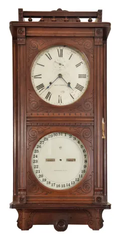 Seth Thomas Clock Co., Thomaston, Conn., 15 day, spring brass movement double dial calendar clock, larger custom or prototype model, with 11 inch dials..