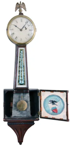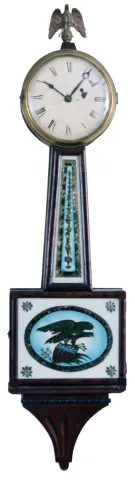 Clocks- 2 (Two): (1) Unknown, Massachusetts, 8 day, weight brass movement patent or banjo timepiece, c1830; (2) Massachusetts, 8 day, weight brass movement Patent or banjo timepiece. Dial is signed "Aaron Willard, Boston", c1825