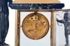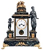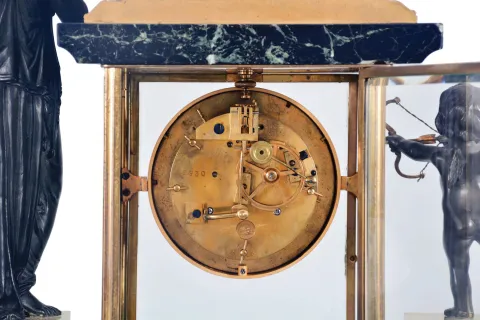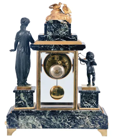 Marti Marble and Ormolu Figural Mantel Clock, Paris, with variegated marble, brass and beveled glass case, porcelain roman numeral dial, and marble plinths for Cupid and probably Aphrodite, the Greek goddess of love flanking a stepped top with ormolu trim