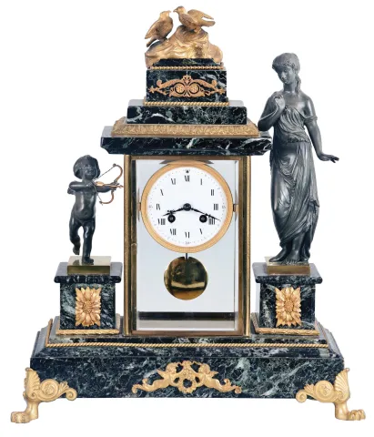 Marti Marble and Ormolu Figural Mantel Clock, Paris, with variegated marble, brass and beveled glass case, porcelain roman numeral dial, and marble plinths for Cupid and probably Aphrodite, the Greek goddess of love flanking a stepped top with ormolu trim and doves in a love nest at the top, all on a raised base with Putti on the facade and gargoyle feet, eight-day round French movement cast Marti emblem on the back plate, count-wheel hour and half hour strike on a bell and brass bob pendulum. Rear left foot is loose. All marble and beveled glass in good condition. slight chipping on dial around winding arbors.