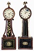 Clocks- 2 (Two): (1) Massachusetts, North Attleboro-style, 8 day, weight brass movement Patent or banjo timepiece; (2) Massachusetts, North Attleboro-style, 8 day, weight brass movement Patent or banjo timepiece. Based on the door latches these could both
