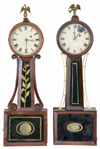 (1) Mahogany and mahogany veneered case in an original finish has a couple small corner chips. Original painted dial has some paint loss at the mounting pins and clear varnish overcoat. Original bottom tablet has lifting of the background and old repairs. The throat glass is a replacement. The wood sidearms and dial bezel have repairs. Top plinth looks to be a replacement; (2) Mahogany and mahogany veneered case in an old and possibly original finish. The veneer on the doors is fine except for a veneer repair on the throat. The period dial has some paint loss at 1 o'clock and may or may not be original to the case as there are extra holes in the head. Replaced minute hand. Throat tablet is a replacement. The bottom tablet looks to be original. The case has repair at the bottom door hinge and the bottom case sides from damage to the bottom board. Brass sidearms are thick and maybe a later addition as these clock cases are not usually found with brass sidearms. Dial door has a repair at the hinge and a shrinkage crack.
