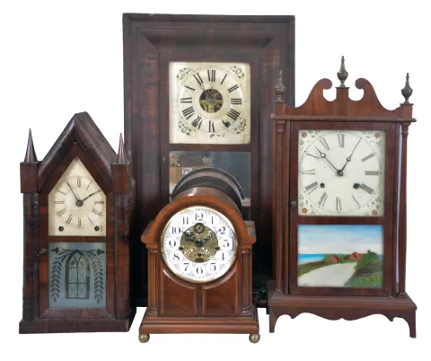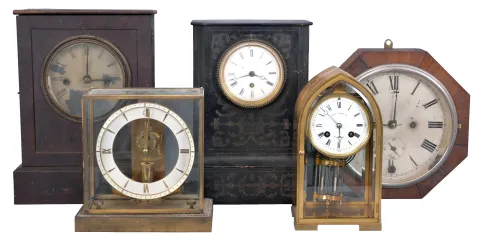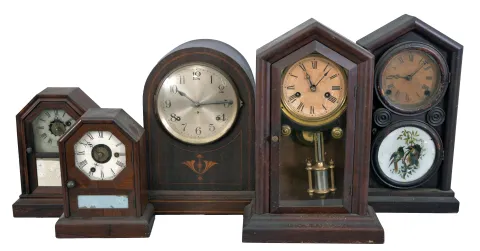 Clocks- 15 (Fifteen) American and European shelf clocks: including a Seth Thomas "Sonora" chime clock, two 30-hour cottage clocks, two Ingraham "Doric" clocks, a Junghans electro-mechanical clock, a brass-cased French clock sold by Tilden Thurber Co., a weight driven ogee clock, a sharp gothic clock, a French time-only mantel clock, a modern chiming bracket clock, two 30-hour clocks by Chauncey Jerome, a small pillar & scroll clock, and a wall clock by the Self-Winding Clock Company. sold for restoration or parts. Sold "as is".