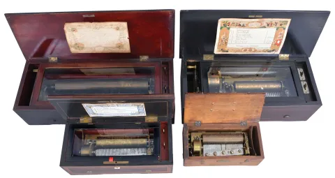 Music Boxes- 4 (Four) Swiss Music Boxes: (1) Switzerland, 6 tunes with a 12 inch cylinder playing on two combs of 40 and 74 teeth in an inlayed rosewood veneered case; (2) Switzerland, 8 tunes with a 6 inch cylinder playing on a 42 tooth comb in an inlayed rosewood and grain painted case; (3) B.A. Bremond, Geneva, Switzerland, 4 tunes with a 6 inch cylinder playing on a single comb of 74 teeth in an inlayed rosewood veneered case with mother of pearl; (4) E.S. Hiddens, New York with a 5 inch cylinder playing on a comb of 86 teeth in a mahogany case. largest music box with segmented comb will play sluggishly when wound. Other three boxes will not play for various reasons and are sold for parts or repair. Dimensions provided are for largest music box. Sold "as is".